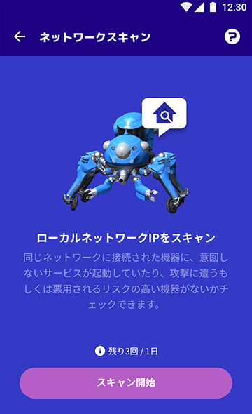 ご使用のスマホをご家庭のWiFi環境に接続している時に限り、ローカルネットワーク内のポートスキャンを実行できます。実行結果を参照して、ご家庭のネットワークのセキュリティ向上に役立てることができます。